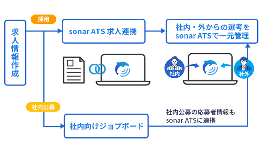ATS(採用管理システム)と連携することで、社内外の採用チャネルをひとつのプラットフォームに統合。人材要件定義から入社までの流れをシームレスにつなげます。